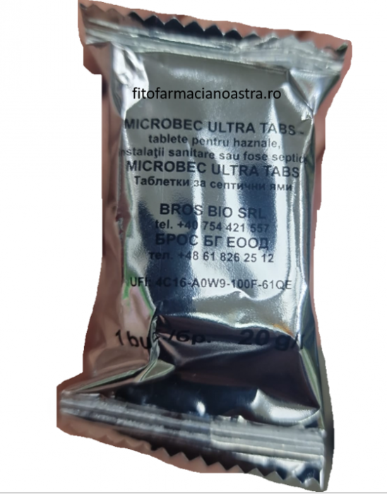 Tratamentul pentru fose septice Bros Microbec, tableta, 20 g este un produs natural care ajută la biodegradarea continutului foselor septice și al haznalelor. Tableta se dizolvă rapid în apă și bacteriile conținute în ea încep să descompună materiile organice, reducând astfel mirosul neplăcut și fluidizând conținutul fosa septică.